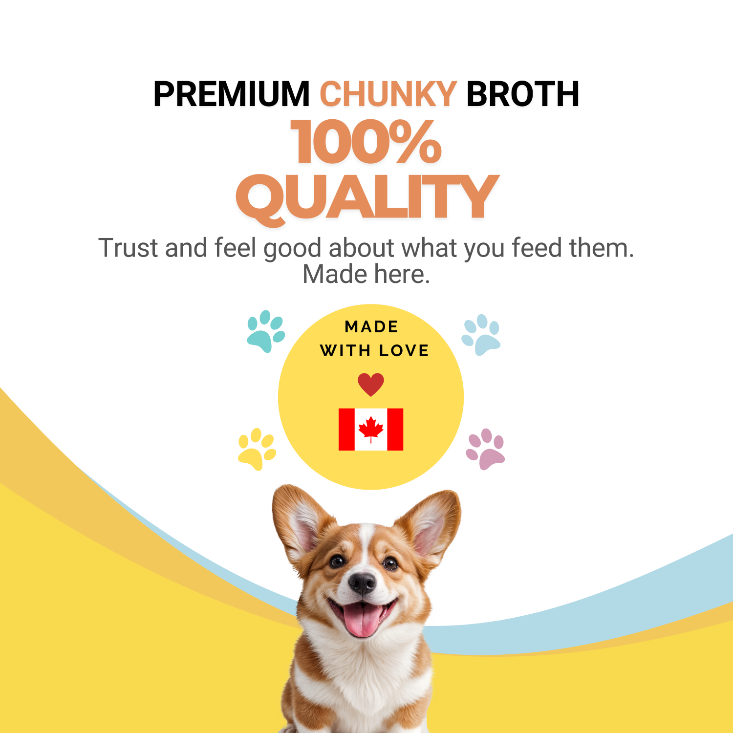 Discover the unparalleled nutrition of TOPZ's Chunky Chicken Bone Broth with Vegetables, a pioneering blend crafted to elevate your dog's dining experience. Our exclusive recipe boasts high-protein chicken and wholesome vegetables, ensuring a 100% natural meal without any preservatives. Proudly made in Canada with human-grade ingredients, this savory broth is a testament to quality and care. High in collagen, our chunky broth supports joint health and offers a concentrated source of protein, vital for your pet's well-being. With TOPZ Chunky Chicken Bone Broth with Vegetables, your dog can indulge in flavors as exceptional as yours!